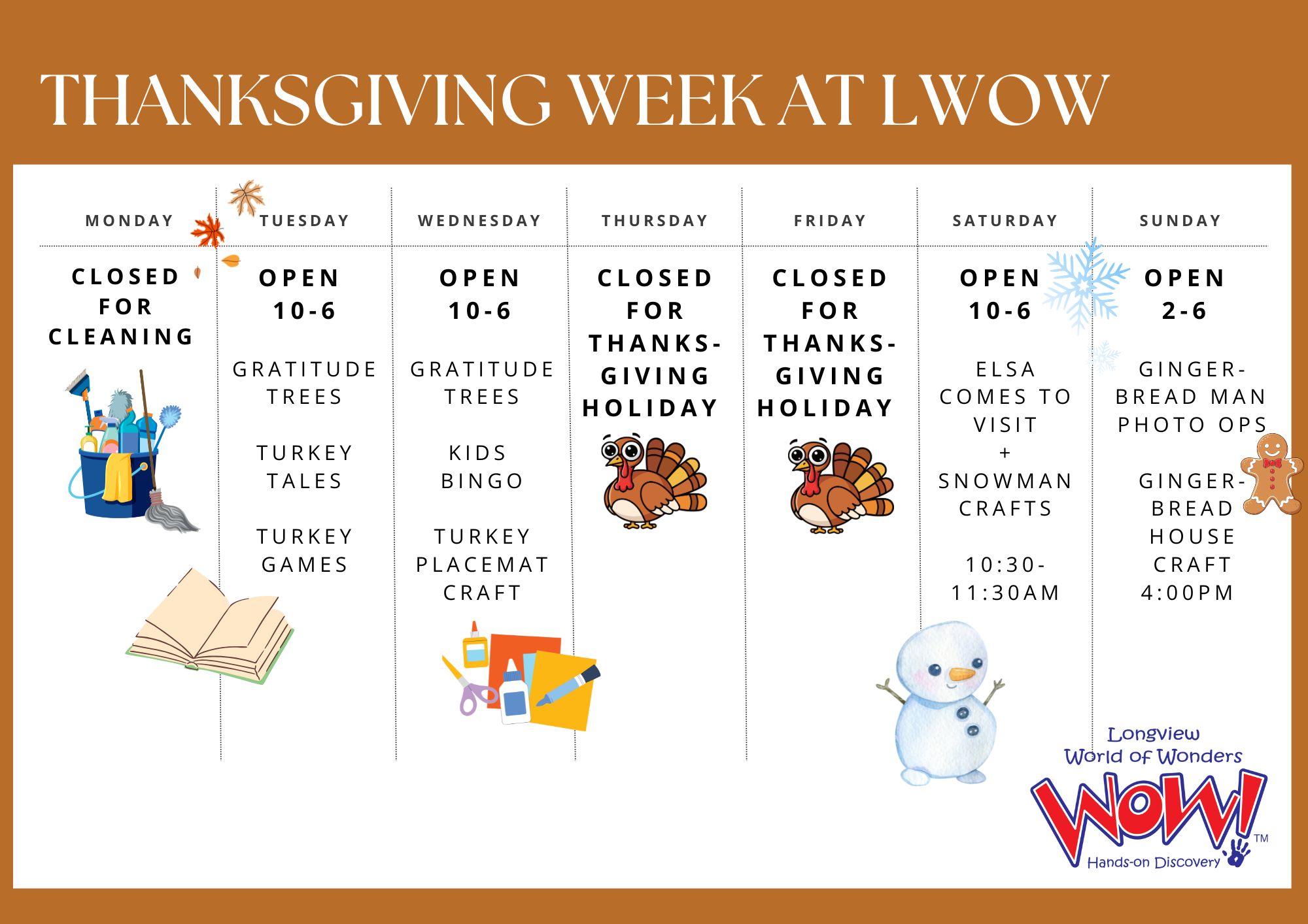 From turkey time to twinkle lights, it’s going to be a week of fun at LongviewWOW next week!